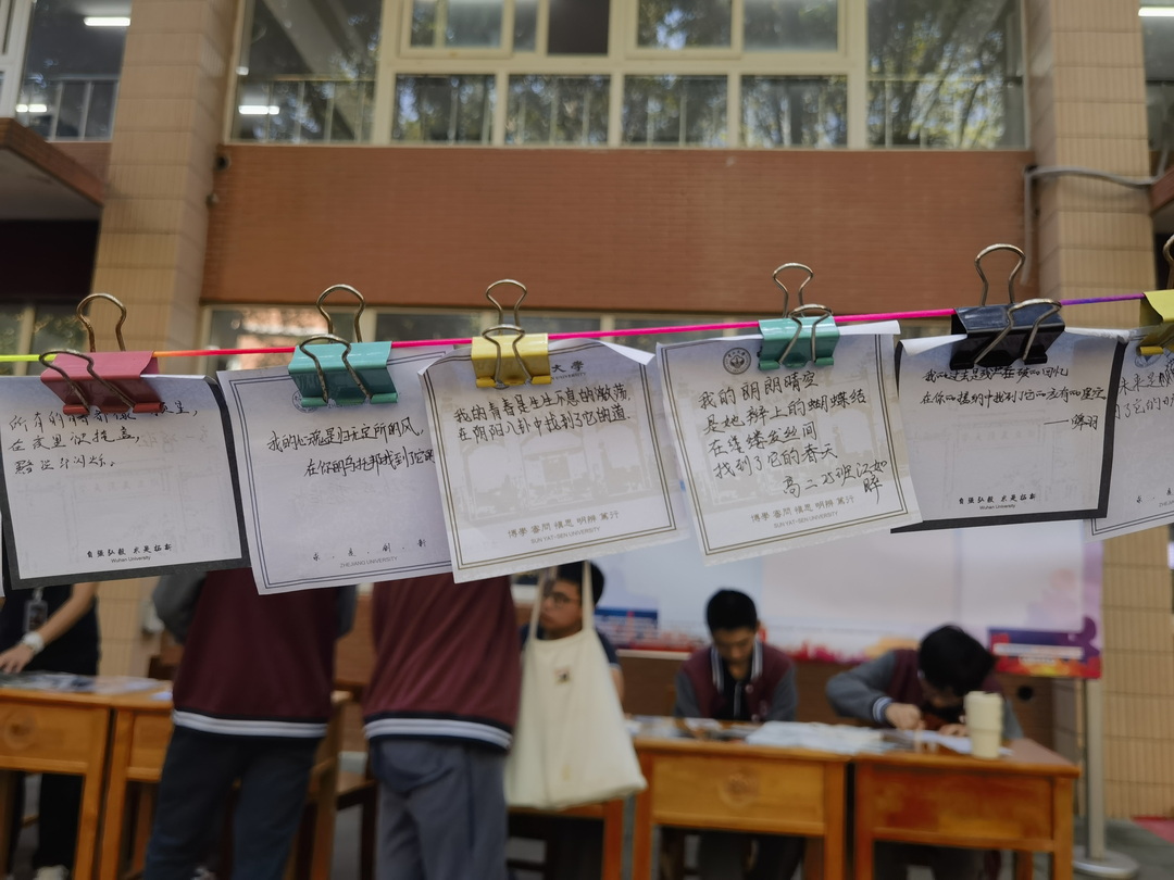 活动的句式由相关工作人员精心挑选,吸引了一大批同学前来创作。参与的同学们认真阅读句式,把握其中的逻辑关系,同时联系自己对生命与生活的感触,化作最精炼的语句表达出来。采采流水,蓬蓬远春,收集上来的句子或文笔优美,或思想深刻,令人拍案叫绝。活动期间,沙坪坝校区学生会学习部同学和团委宣传部同学耐心解答同学们的疑问,维持现场秩序,让活动既热烈又有条不紊地开展。