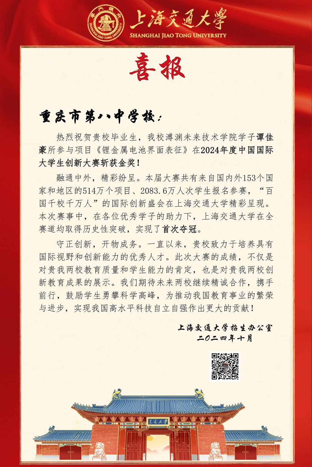 上海交通大学发来喜报,祝贺我校毕业生谭佳豪同学,在2024年度中国国际大学生创新大赛斩获金奖。