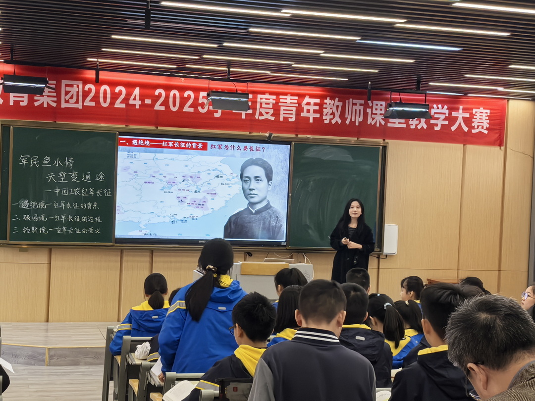 紧接着授课的是渝北校区初二年级的胥力郡老师,她深情地讲述了《中国工农红军长征》的光辉岁月。胥老师以一种别开生面的方式开启了课堂,她播放了重庆八中男神合唱团深情演绎的《迎风飘扬的旗》,激昂的旋律瞬间抓住了学生们的心弦。随后,胥老师抛出了一个引人深思的问题:“为何说雪山和草地成为了引领我们从胜利走向胜利的明灯?”这一问,仿佛在学生与历史之间架起了一座桥梁,拉近了彼此的距离。胥老师将课程设计得既条理清晰又充满情感,分为“遇绝境——长征背景”、“破困境——长征过程”和“拓新境——长征意义”三大板块。在第一部分,她通过一连串精心设计的问题链,像一把钥匙,逐一解锁了红军踏上长征征途的复杂背景和迫切原因,使得历史的脉络在学生心中逐渐清晰起来。进入第二部分,胥老师将课堂变成了一段穿越时空的历史之旅。深入挖掘历史细节,匠心独运地设计了“历史故事会”、“历史演艺厅”和“历史诊断室”等一系列活动。在这些活动中,学生们仿佛亲眼见证了红军战士们在长征路上的英勇与坚韧,动情的讲述和生动的演绎让他们深刻体会到了革命乐观主义、革命英雄主义和革命集体主义在长征过程中的光辉体现。这些精神力量,如同璀璨的星辰,照亮了学生们的心灵,激发了他们内心的共鸣与敬仰。整堂课胥老师不仅传授了历史知识,更是一次深刻的精神洗礼,让学生们在回望历史的同时,也思考着如何将这些宝贵的精神财富传承并发扬光大。