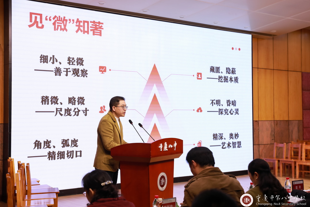 重庆八中党委副书记、校长卿知人老师宣读本次比赛结果,并作总结性点评。卿校长指出微班会看似小,但应该以小见大。他分别从大立意、大格局、大思维、大生活、大反思五个方面,概括了微班会在设计和实施的过程中,应该追求的目标。