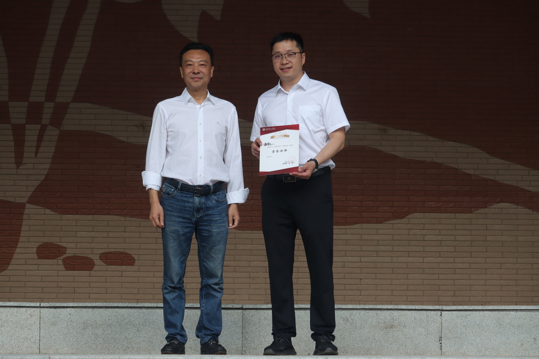 重庆八中校长卿知人老师为罗钰博同学颁发“朝会大讲堂优秀演讲证书”,为谢凯老师颁发“朝会大讲堂荣誉讲师证书”。