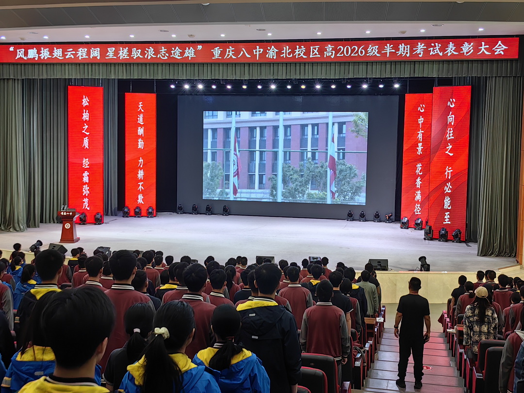 2025年4月29日晚6点30分,重庆八中渝北校区高2026级全体师生在大礼堂举行了主题为"风鹏振翅云程阔,星槎驭浪志途雄"的半期表彰大会。高二1班吴炳星和2班李欣悦两位同学主持会议。这场星光熠熠的盛典,既是荣耀的加冕礼,更是新征程的誓师会。