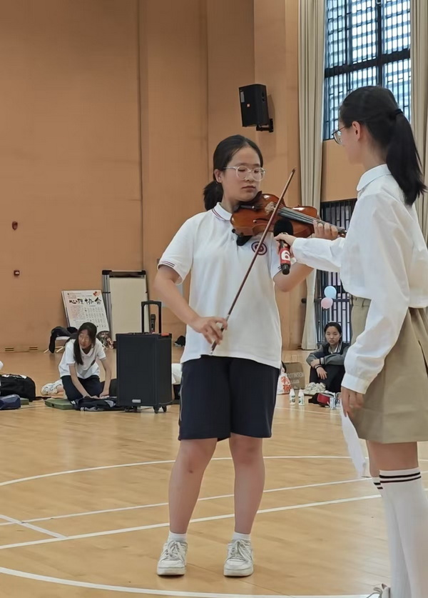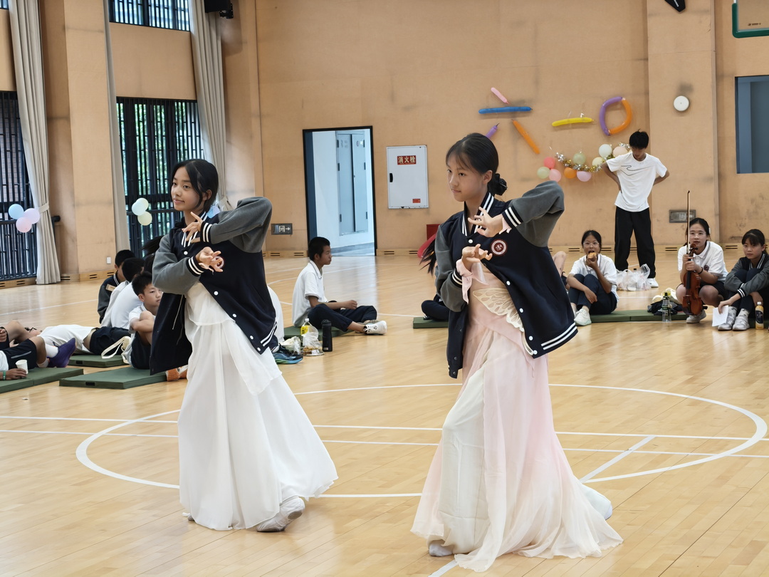 随着动感十足的电子音乐响起,初一年级组成的现代舞小分队闪亮登场,他们踩着鼓点跳起活力四射的爵士舞。利落的踢腿、帅气的滑步,配合极具感染力的节奏,瞬间点燃全场气氛。观众席上,同学们自发组成“应援团”,挥舞着的荧光棒,欢呼声、喝彩声此起彼伏,响彻整个场馆。