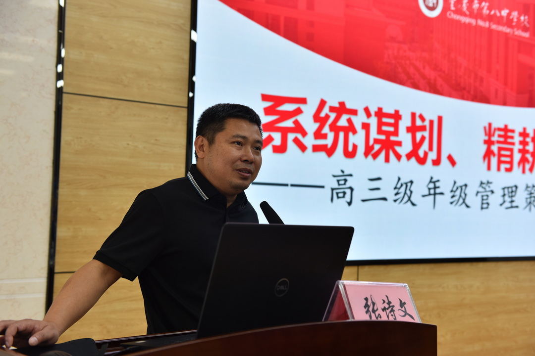 张诗文围绕“高三年级管理的思考与策略”主题展开分享,他提到,高三年级管理工作重点分为“管理策略、拔尖人才培养、后期管理工作”三大板块。管理应从顶层设计、人才管理、学生管理、教学管理着手,先进行宏观谋划,再进行细化管理;拔尖生培养方面,他分享了八中对于优生的培养方式:集中培养与个性化培养同步进行,培养路径既要借助外力,也要自主培养;后期管理工作应落实教学常规、做好强化训练管理、加强自身学科培优等,为参会教师提供育人经验与管理启示。