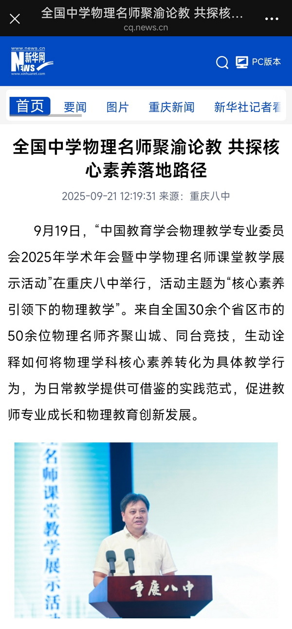 9月19日,“中国教育学会物理教学专业委员会2025年学术年会暨中学物理名师课堂教学展示活动”在重庆八中举行,活动主题为“核心素养引领下的物理教学”。来自全国30余个省区市的50余位物理名师齐聚山城、同台竞技,生动诠释如何将物理学科核心素养转化为具体教学行为,为日常教学提供可借鉴的实践范式,促进教师专业成长和物理教育创新发展。