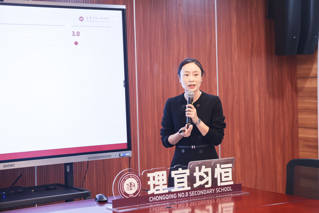 汇报中,朱艳重点阐述了学校选项教学的实施保障与创新举措。在师资方面,38名毕业于名校的体育教师组成专业团队,涵盖10余个运动专项,人均能承担2-3个项目教学,为选项教学提供了坚实支撑;场地设施上,室内外运动场馆、AI运动馆、水上运动中心等一应俱全,20块篮球场、10块排球场、70余台乒乓球台等设施充分满足各类项目教学需求;在教学模式上,学校全面推行“学练赛一体化”,将螺旋发展策略融入课程设计,确保教学内容由易到难、衔接有序,同时借助智能设备监测、多元评价体系等现代教育手段,实现“科技赋能体育教学”的目标。详实的数据、清晰的逻辑与鲜活的案例,让评委们对重庆八中体育选项教学的系统性与实践性给予充分肯定。