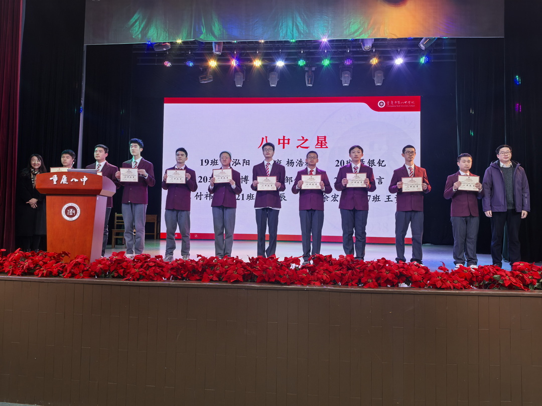随后进行的是“八中之星”表彰,余泓阳、杨浩林、聂银钇、唐小博、邹依林欣、万品言、付祎炜、夏睿辰、余宏赫、王资博等十位同学因在学业、品德等方面的综合优异表现获评。重庆八中教务处主任熊翼老师与重庆八中学生处主任罗来莉老师共同为获奖学生颁奖。