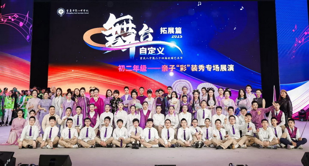 12月25日,重庆八中大礼堂内,第二十四届校园艺术节“初二亲子彩妆秀专场展演”在温馨而热烈的气氛中举行。这场别开生面的活动,打破了传统舞台表演的界限,让初二学生与自己的家人共同参与了创意设计与舞台展示,呈现了一场集创意、亲情与班级文化于一体的视觉盛宴。