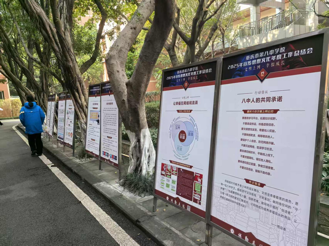 活动还向全校师生发出“五要五不要”倡议,做文明上网八中人。不少同学观展后表示:“展板内容真实又实用,让我明白文明上网不仅是责任,更是让自己在网络世界收获幸福的秘诀。”