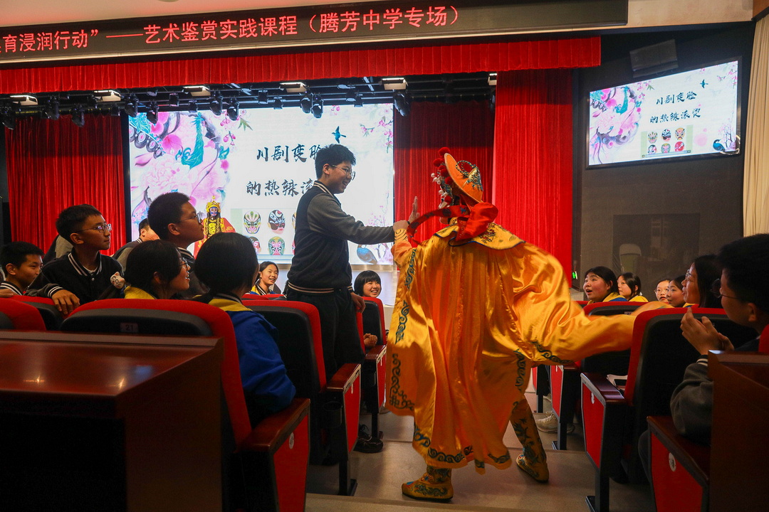 2026年4月1日,春意盎然的重庆八中腾芳中学校园内,一场别开生面的 “美育浸润行动” 艺术鉴赏实践课——《梨园撷英》正在热烈举行。本次活动旨在通过沉浸式的艺术体验,让学生近距离感受中国传统戏曲艺术的独特魅力,提升审美素养,厚植文化自信。