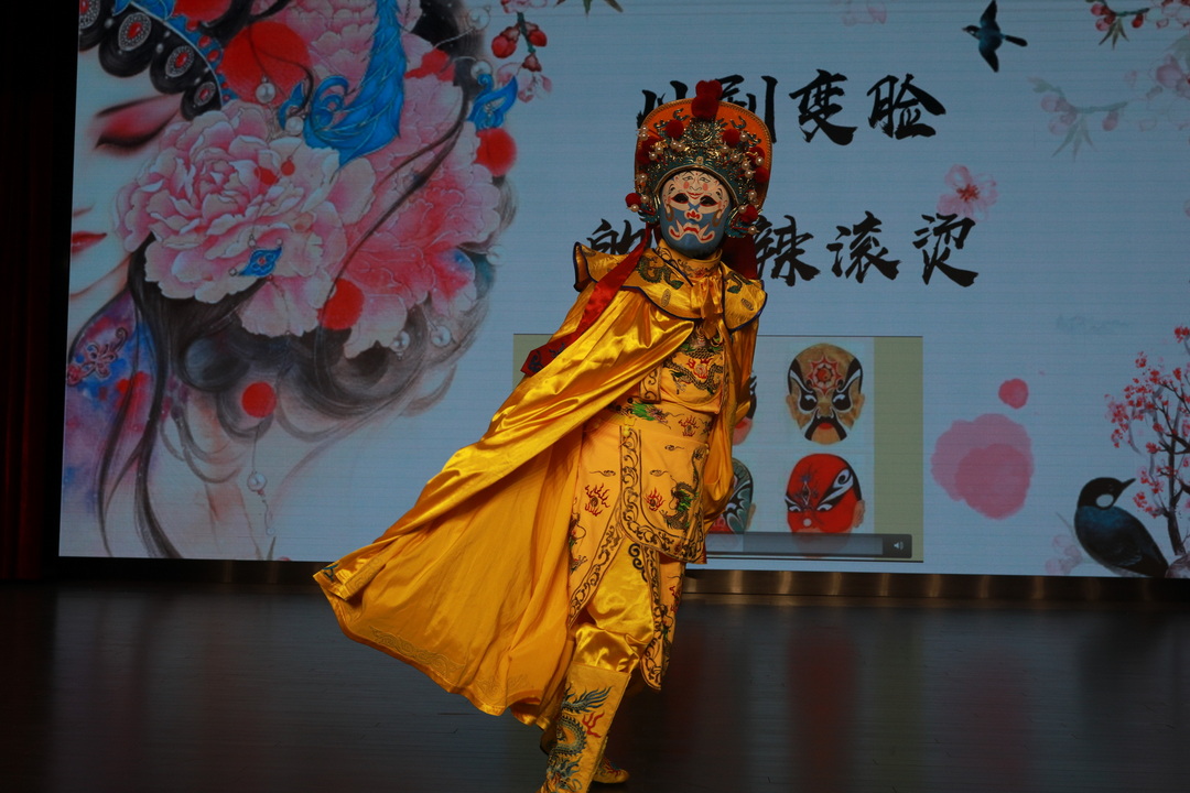 随后,活动进入经典片段赏析环节。《别洞观景》灵动飘逸,演员翎子轻扬、身段柔美,念白清脆灵动,将白鳝仙姑的天真烂漫与灵动娇俏演绎得淋漓尽致,只一颦一笑、一步一姿,便让同学们深深沉醉于川剧独有的韵味与魅力之中;《八阵图》惊险武打更是将生角之刚的翻滚腾挪演绎得淋漓尽致,那眉宇间藏不住的英气是困境中难掩的焦灼与坚韧;川剧变脸惊喜奇幻,演员指尖轻挥、身形一转,一张张脸谱瞬息变换,行云流水、神秘莫测。现场掌声、欢呼声、惊叹声此起彼伏,同学们目不转睛,真切地感受到非遗技艺的神奇与震撼。一幕幕经典戏曲选段的演出,让同学们沉浸在传统艺术的视听盛宴中。演员老师们精湛的技艺,无论是婉转的唱腔、优美的身段,还是刚劲有力的武打场面,都赢得了同学们阵阵热烈的掌声。