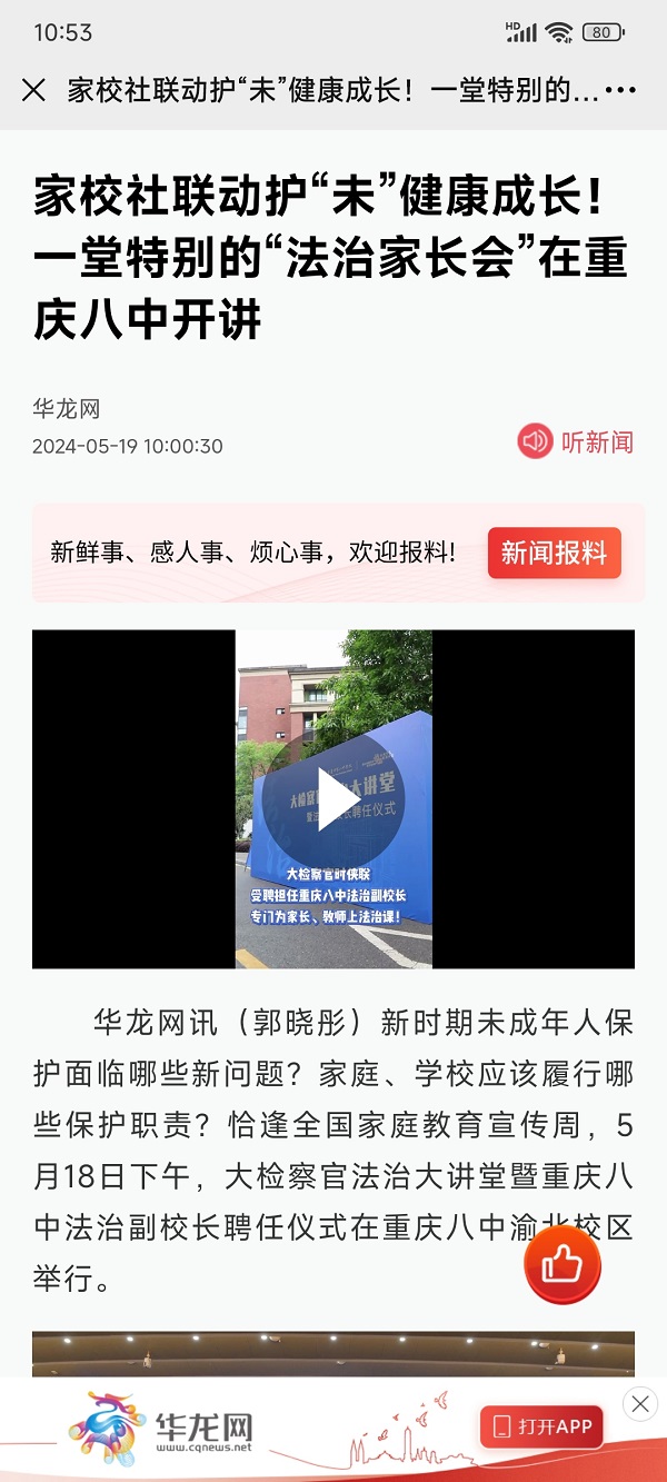 华龙网讯(郭晓彤)新时期未成年人保护面临哪些新问题?家庭、学校应该履行哪些保护职责?恰逢全国家庭教育宣传周,5月18日下午,大检察官法治大讲堂暨重庆八中法治副校长聘任仪式在重庆八中渝北校区举行。