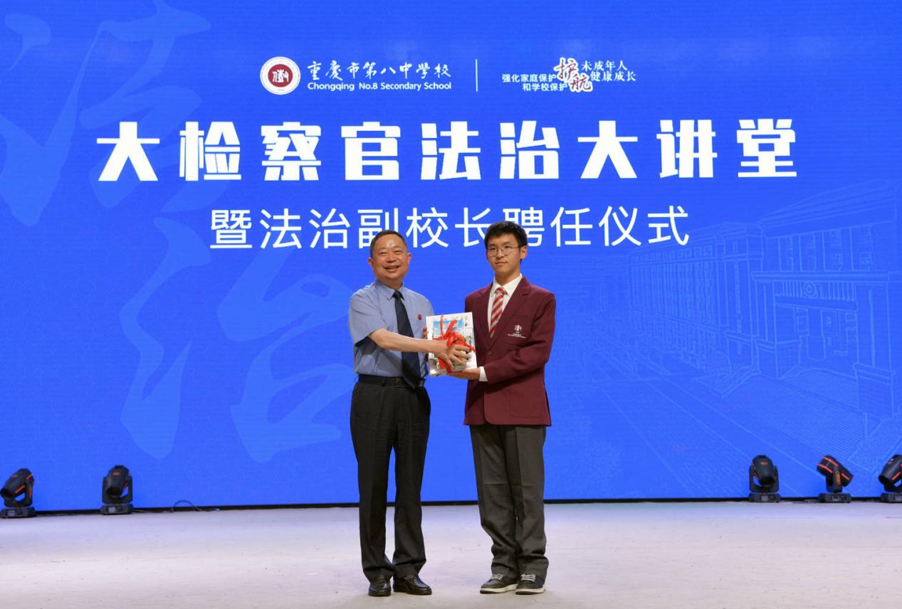 活动现场,重庆八中党委书记、重庆八中教育集团总校长周迎春为重庆市人民检察院党组书记、检察长时侠联颁发法治副校长聘书,时侠联检察长给学生代表赠送法治书籍。随后,时侠联检察长以《强化家庭保护和学校保护,护航未成年人健康成长》为题开讲法治课。千余名学校教师和家长代表现场聆听。