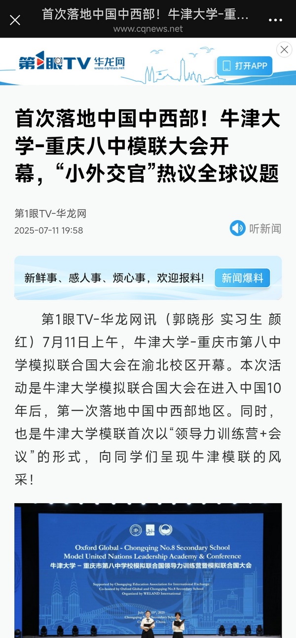 第1眼TV-华龙网讯(郭晓彤 实习生 颜红)7月11日上午,牛津大学-重庆市第八中学模拟联合国大会在渝北校区开幕。本次活动是牛津大学模拟联合国大会在进入中国10年后,第一次落地中国中西部地区。同时,也是牛津大学模联首次以“领导力训练营+会议”的形式,向同学们呈现牛津模联的风采!
