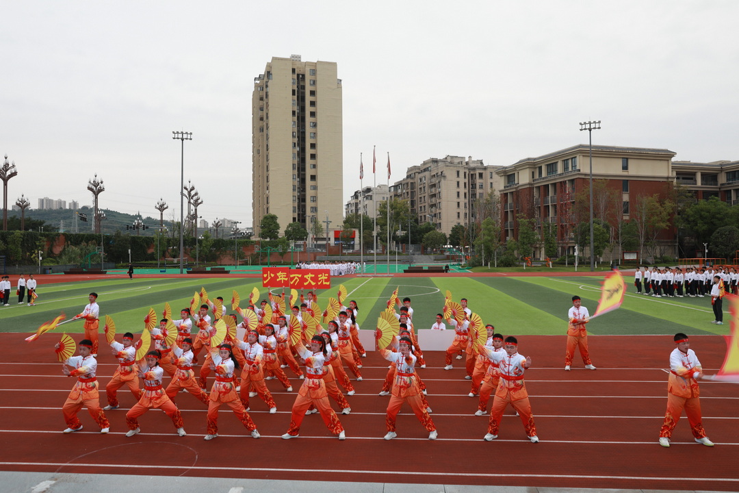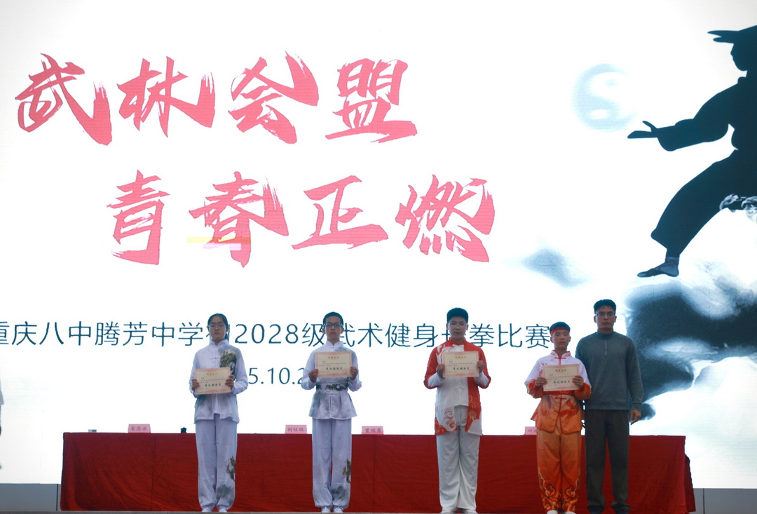 2025年10月24日下午,重庆八中腾芳中学田径场上旌旗招展,喝彩震天。以“武林会盟,青春正燃”为主题的初2028级武术健身长拳比赛在秋日桂香中隆重举行。初二年级的同学以精湛的五步拳表演拉开赛事序幕,全体初一年级学子随后以武会友,尽显腾芳少年的蓬勃朝气与刚健风骨。