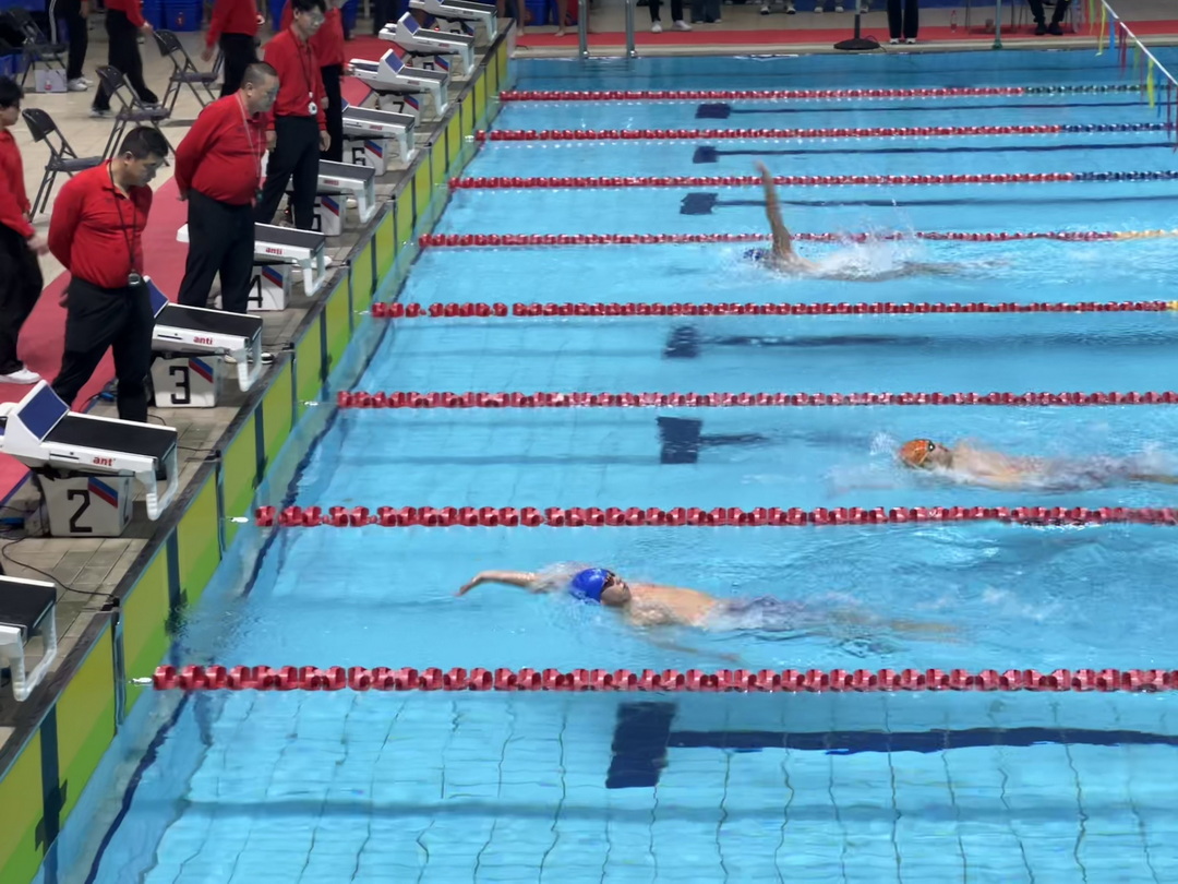 但年龄差距并未阻挡梅孝贤的冲劲。当他站上赛场时,熟悉的竞技氛围瞬间点燃了他的斗志,“不触壁不放弃”的信念贯穿比赛全程。决赛哨声响起,他迅速入水,在蝶泳、仰泳、蛙泳三个泳姿阶段始终保持领先优势,每一次划水、每一次转身都展现出扎实的技术功底与强大的节奏把控能力。
