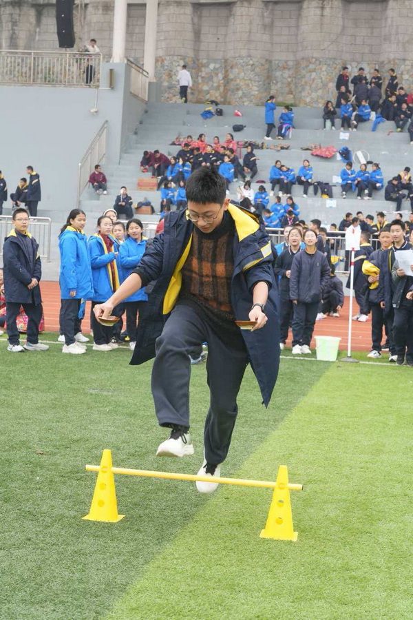 本次运动会的比赛项目巧妙融合传统文化与趣味竞技,既有脑力闯关的智慧博弈,更有体力协作的团队比拼。在“反弹琵琶跃长绳”项目中,学子们模仿敦煌壁画中飞天的舒展姿态,在长绳跃动间舒展肢体,将古典艺术与体育锻炼完美结合;“抱瓮灌园运水赛”以古代农耕场景为灵感,选手们手持仿古陶瓮小心翼翼运送水源,既要追求速度,更要保证稳度,在趣味比拼中重现古人劳作的生活智慧;“驿使传书接力赛”里,学子们化身“古代驿使”,手持仿制竹简奋力奔跑,在接力传递中还原“八百里加急”的紧张节奏与高效协作,让传统文化在运动中可感可触。