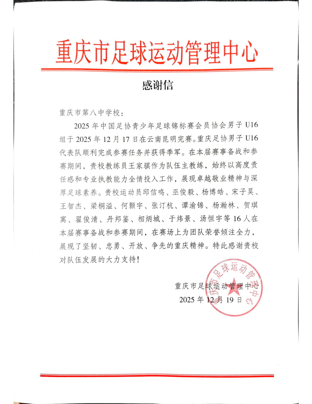 近日,重庆市足球运动管理中心向重庆市第八中学校发来感谢信,对该校在2025年中国足协青少年足球锦标赛会员协会男子U16组赛事中给予重庆足协代表队的大力支持致以诚挚谢意。以重庆八中高水平足球队为核心班底的重庆足协U16队,在本届赛事中奋勇拼搏,最终斩获全国季军,为重庆足球赢得了荣誉。