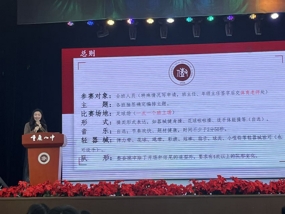 体育铸魂,青春逐梦。相信在接下来的自编操比赛中,重庆八中高一年级学子将把培训所学转化为创作动力,以创意为笔、以活力为墨,编排出具特色、有温度、显风采的自编操作品,在赛场上展现八中学子奋发向上、朝气蓬勃的青春模样,用运动诠释热爱,用拼搏书写担当!